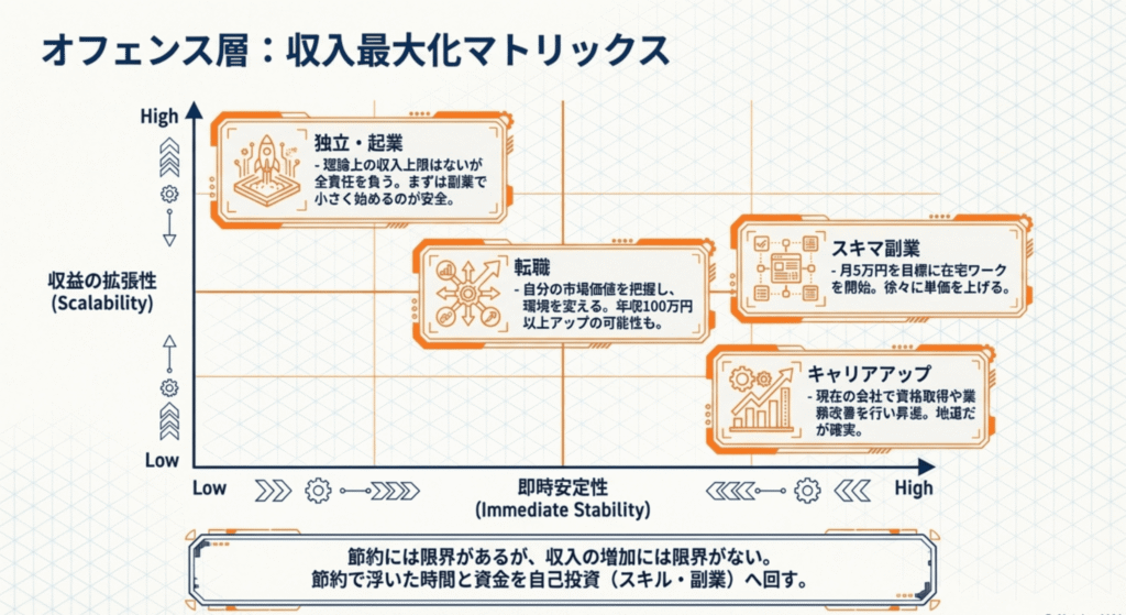 支出を最適化したら、次は入ってくるお金の総額を増やすフェーズです。収入アップには主に4つの選択肢があります。