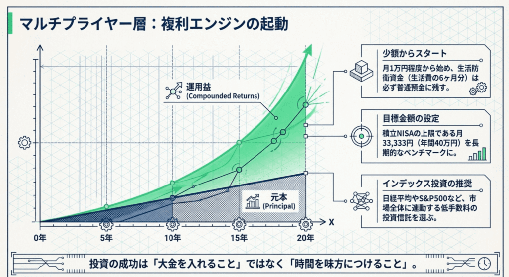 - 投資信託(インデックス型) 市場全体に分散投資する手法です。月1万円程度の少額から始め、複利効果を最大化させましょう。