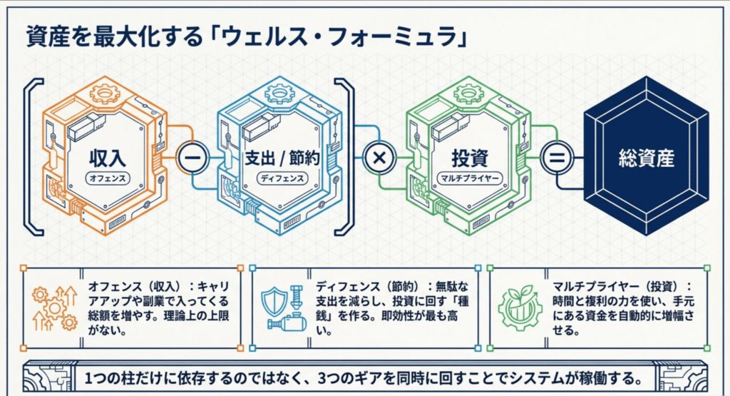 本記事では、パーソナルファイナンスの専門家として、お金を増やすためのアプローチを「収入・投資・節約」という3つの柱に整理しました。これらをいかに戦略的に組み合わせ、あなたの生活に「増える仕組み」を組み込むか。その具体的なライフハックを解説します。